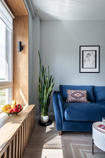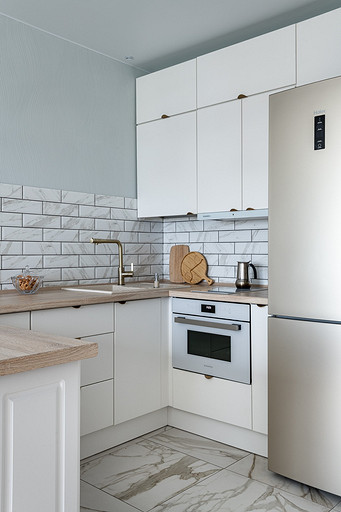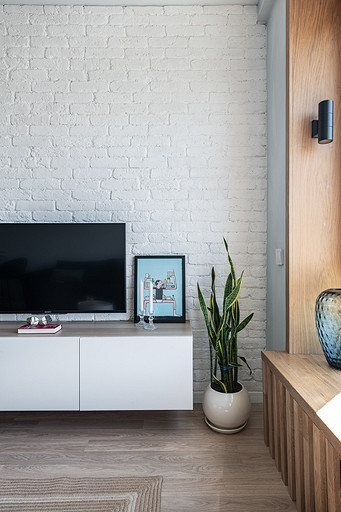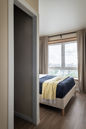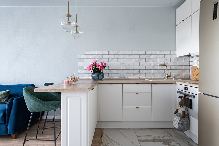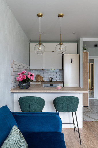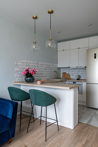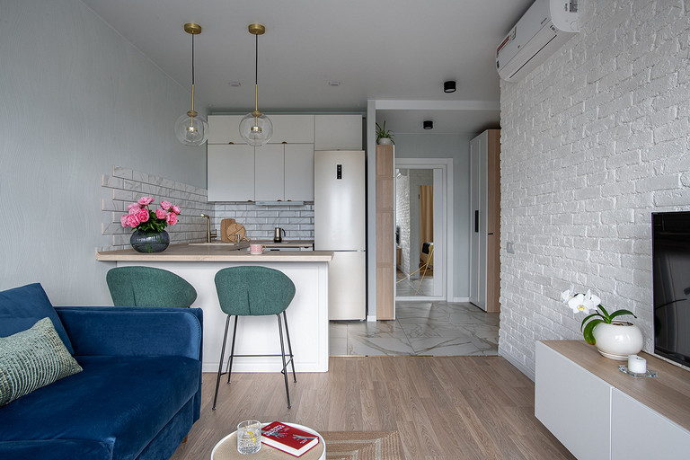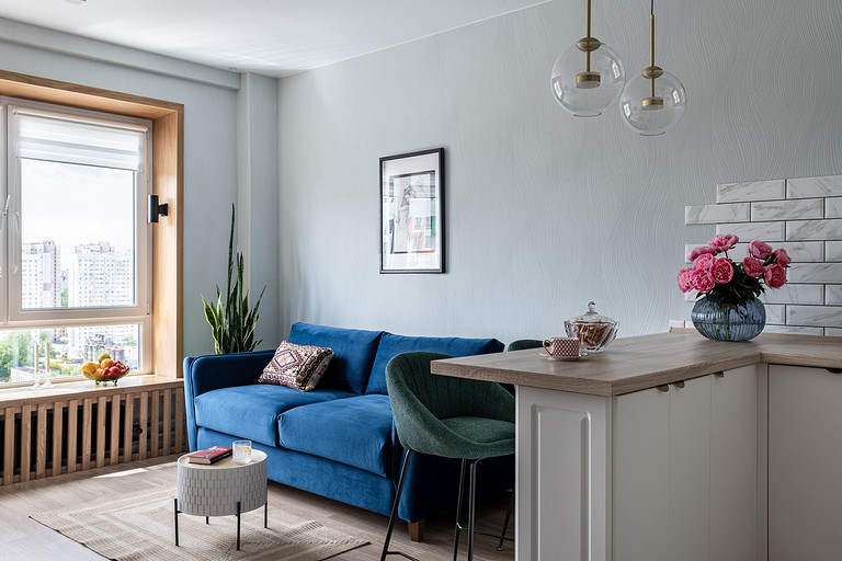 - Мебель: кухня kuhzavod.ru, полубарные стулья «Верона Мебель», диван Parfe, гардеробная система Larvidj, кровать iModern, тумбочки «Ангстрем»