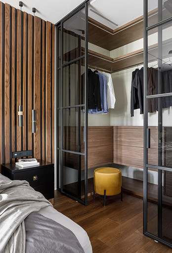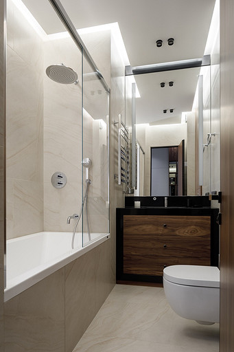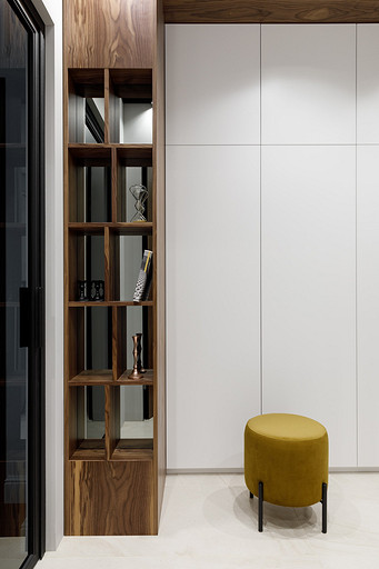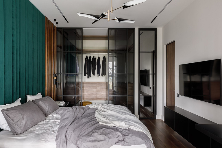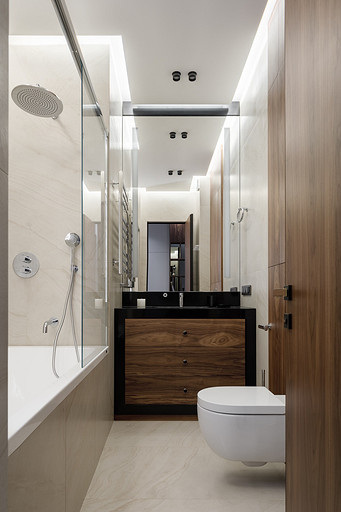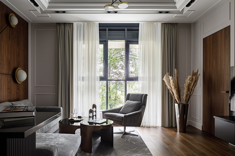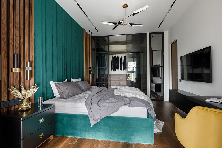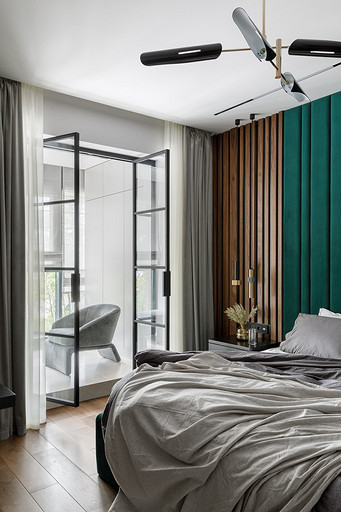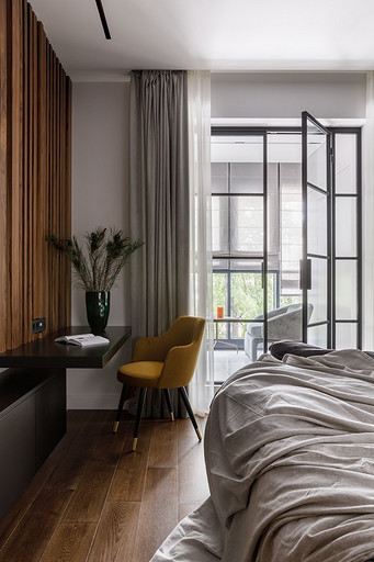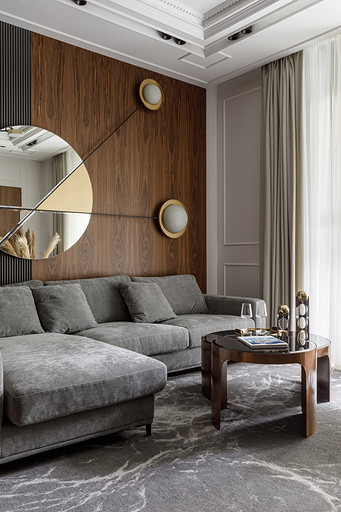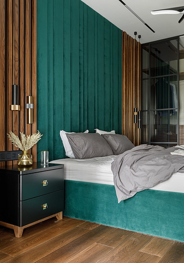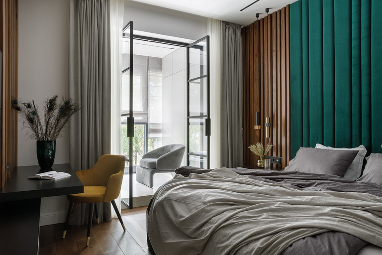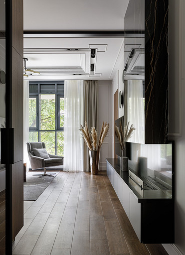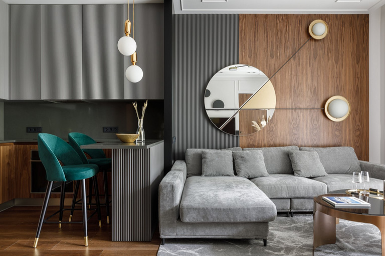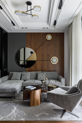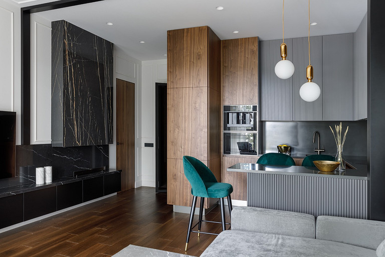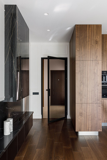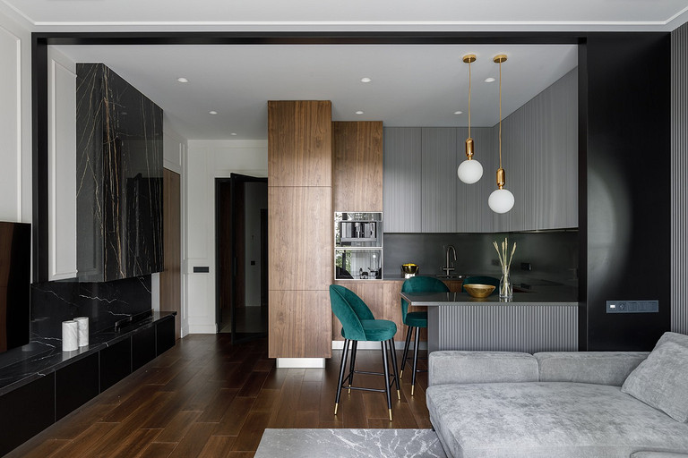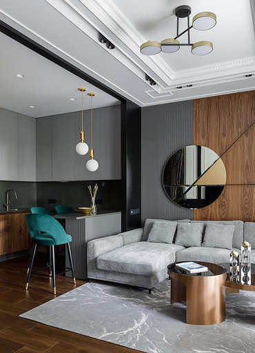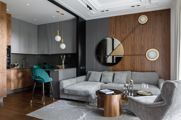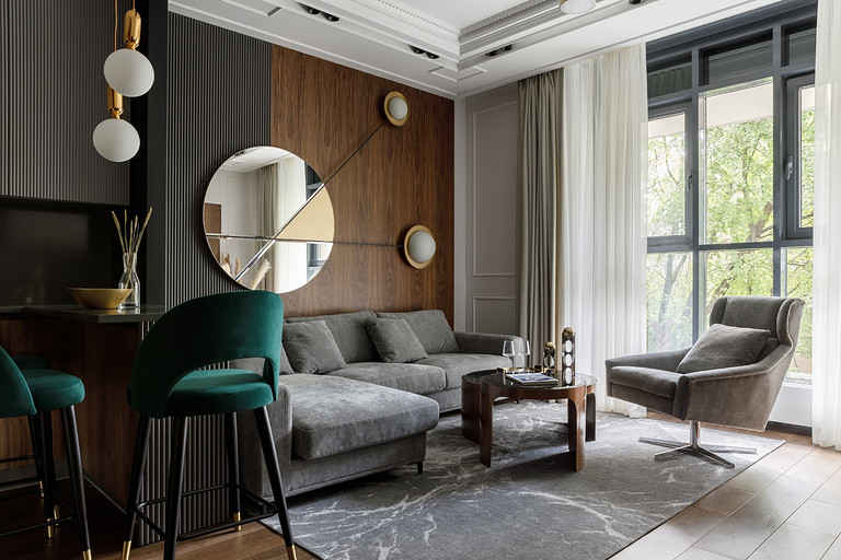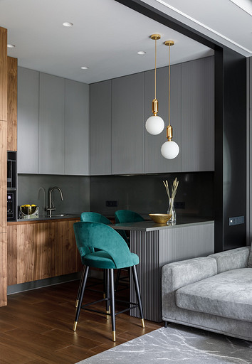 В наполненном интересными деталями интерьере, в отделке из натурального дерева, металлических аксессуарах и бархатной обивке мягкой мебели ощущается умеренная, но нужная брутальность. Многие элементы изготовлены в стиле ар-деко по эскизам автора проекта. Читать далее...