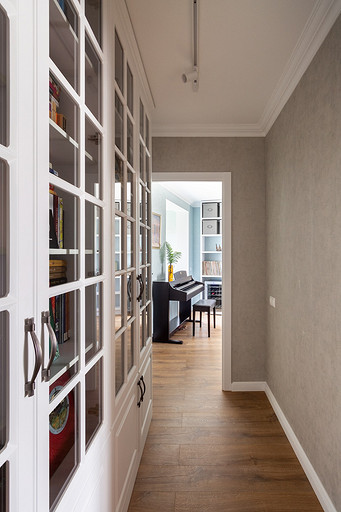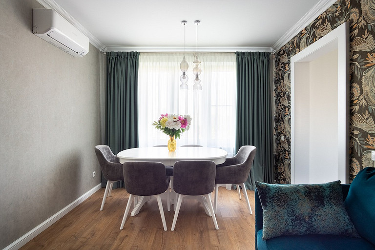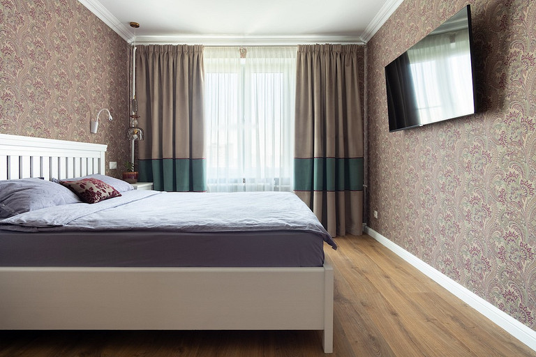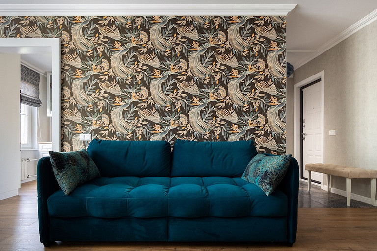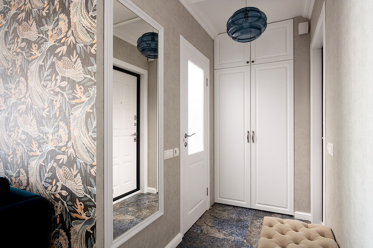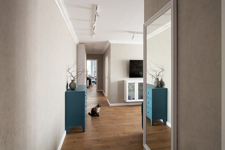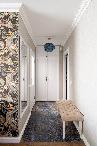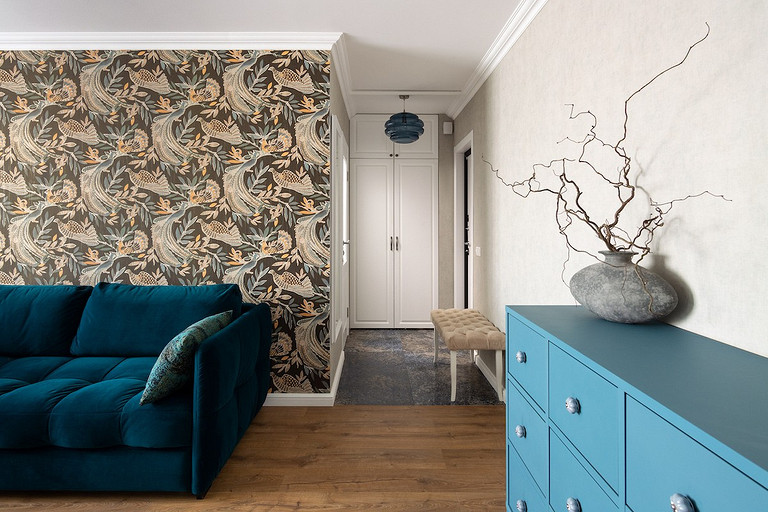 - Стены: фоновые обои BN International, акцентные обои в гостиной Sirpi, обои в спальне Ada Wall, обои в кабинете и на лоджии Lutece, обои на кухне Marburg