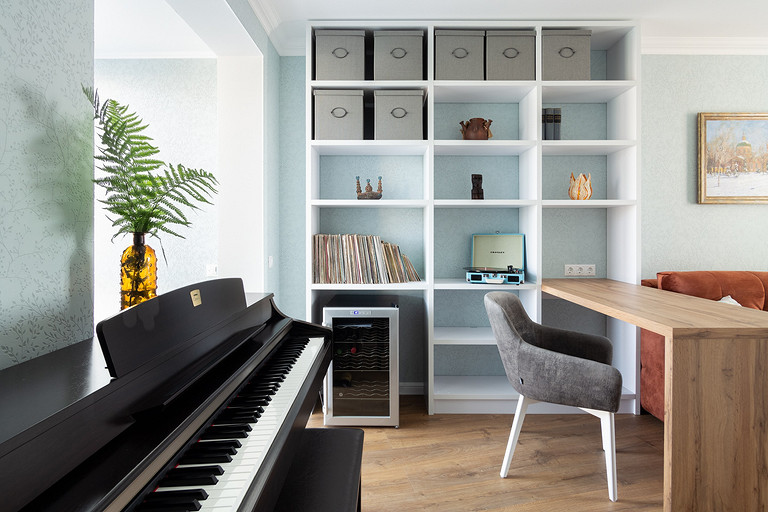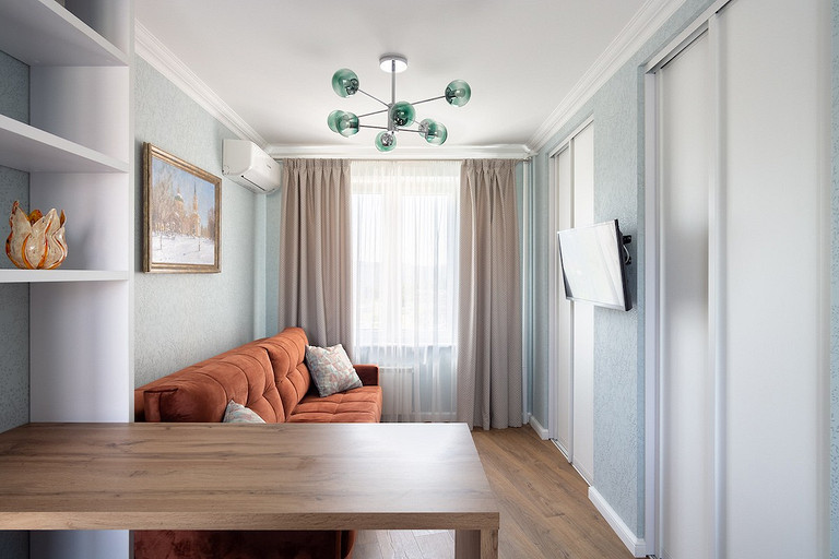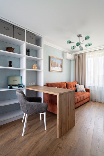 - Мебель: диван в гостиной Carat, диван в кабинете Moon, кровать «Райтон», стулья Annihaus, корпусная мебель выполнена на заказ