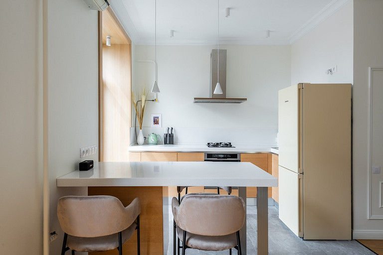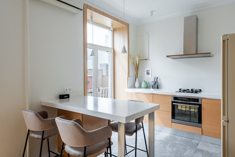 - Мебель: диван Inmyroom, кресло Imodern, тумба Mr.Hide, кухонный гарнитур и барная стойка Scavolini, барные стулья DeepHouse