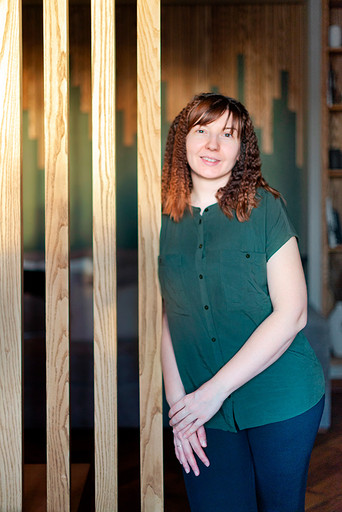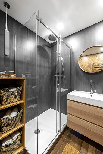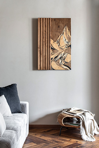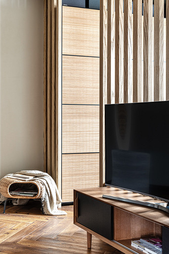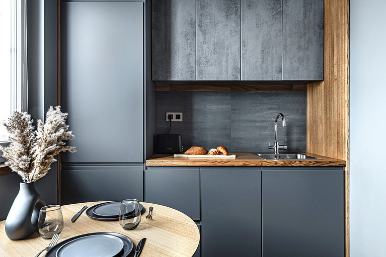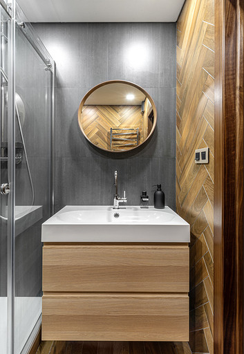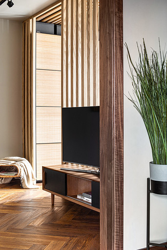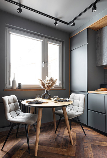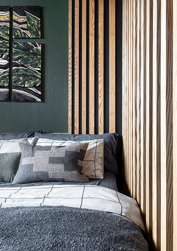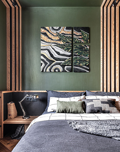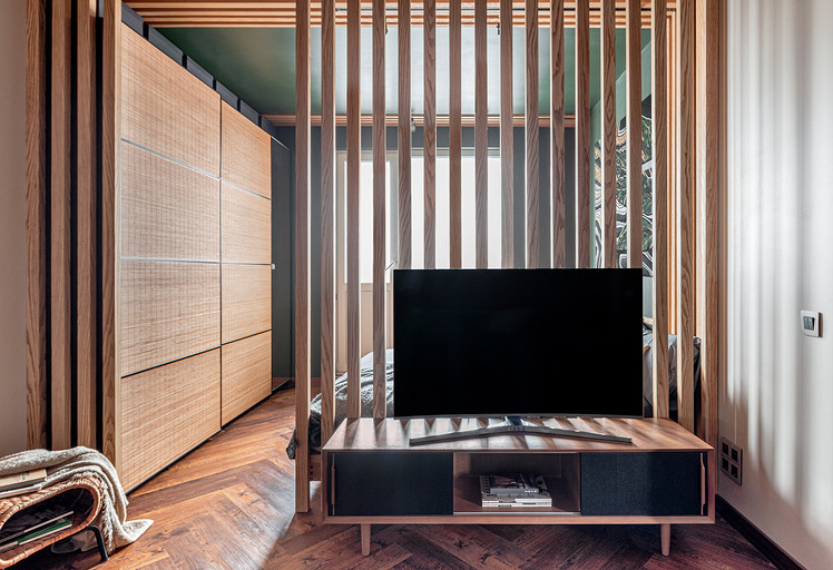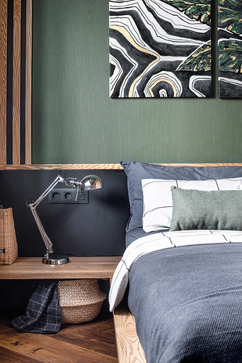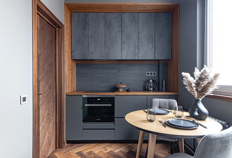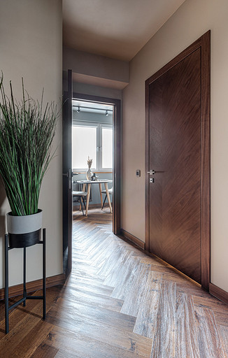 Небольшая однокомнатная квартира в доме серии П-44 для мужчины. Доминантой в интерьере выступает яркая и выразительная текстура шпона и массива ясеня, которую оттеняет темно зеленые и серые оттенки цвета стен.