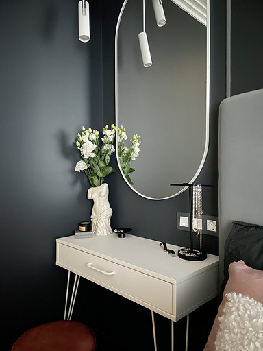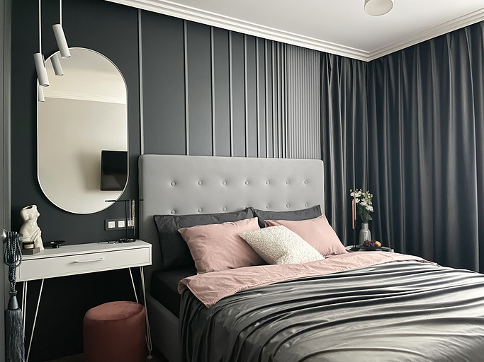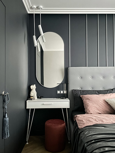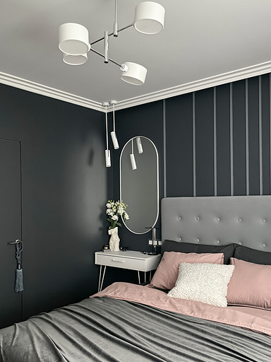 Современная классика и темные тона в интерьере спальни для молодой девушки.