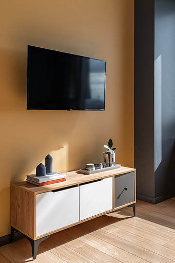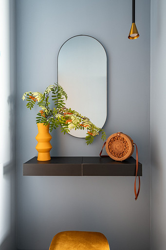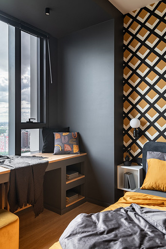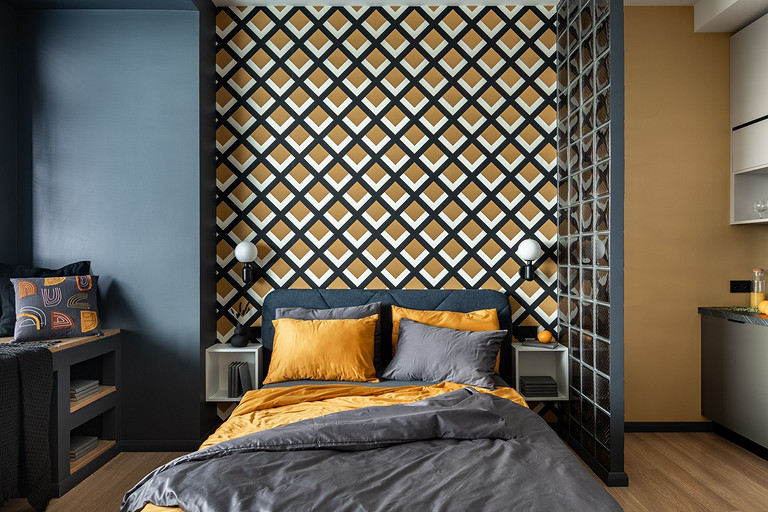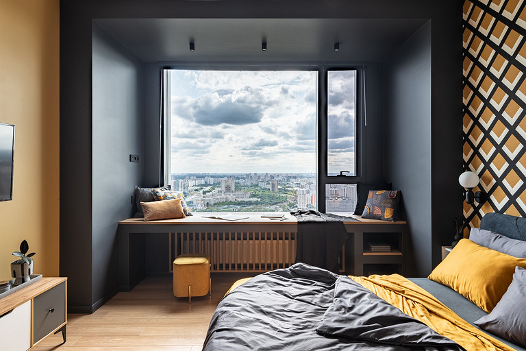 - Мебель: кухня сделана на заказ, кровать divan.ru, прикроватные полки-тумбочки Inmyroom, тумба под ТВ «Леруа Мерлен»