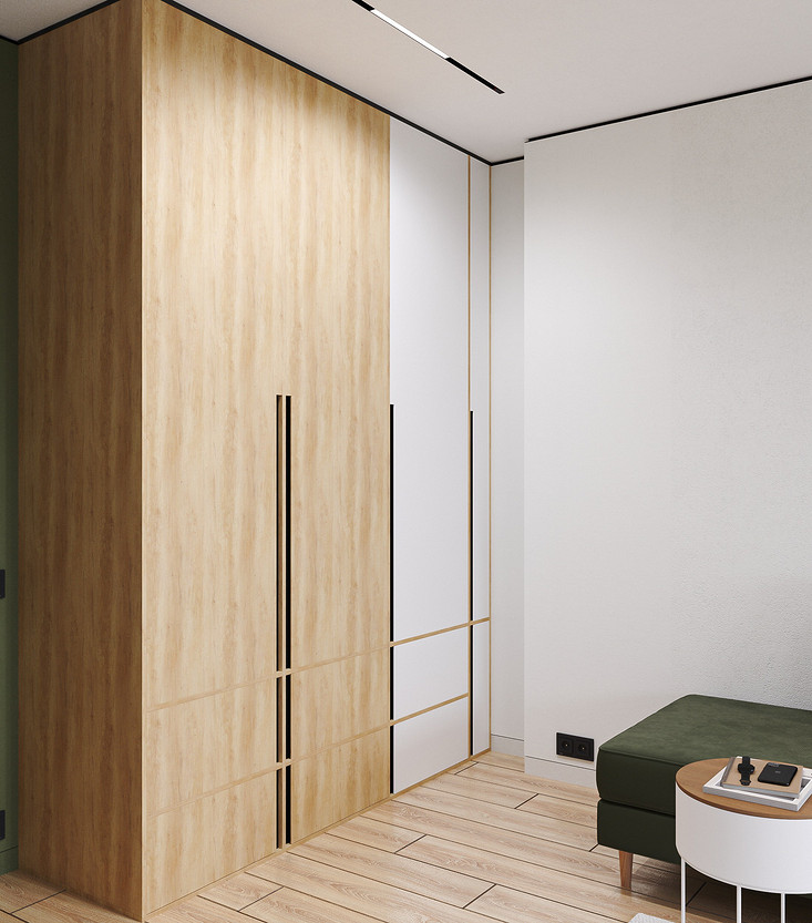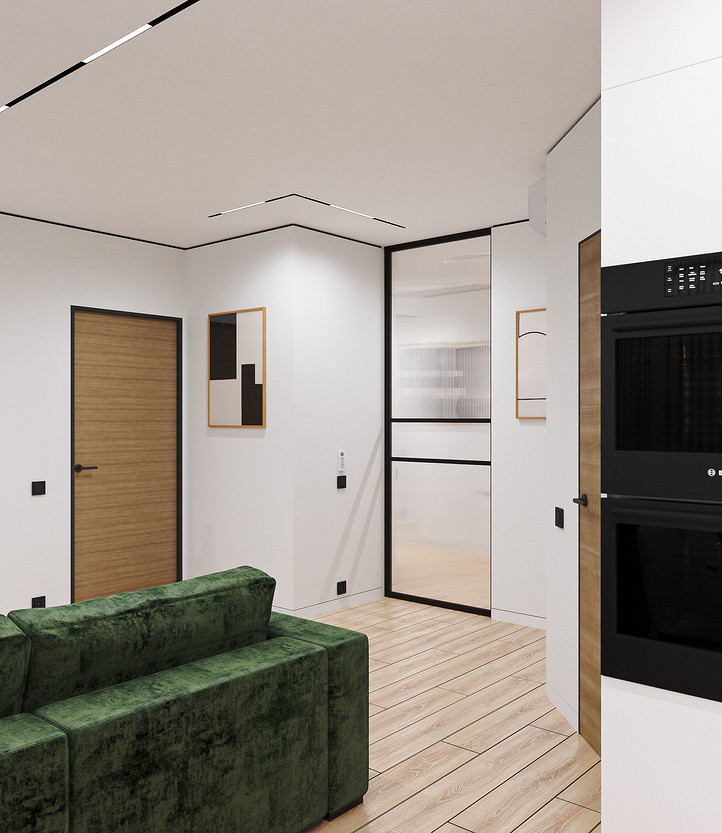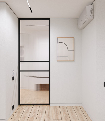 В прихожую ведет раздвижная стеклянная перегородка. Это было важно, т.к. в семье маленький ребенок, чтобы он не выползал в прихожую.