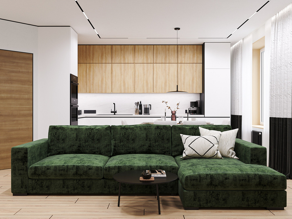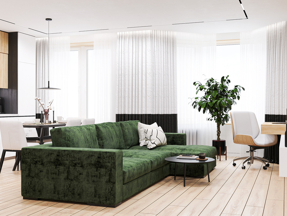Общий вид на гостиную. Диван служит акцентном и перегородкой между зонами, при этом общее пространство больше никак не делится.
