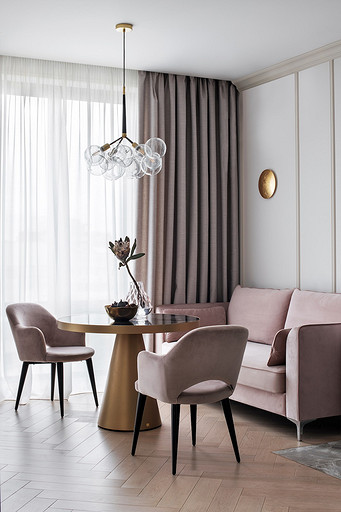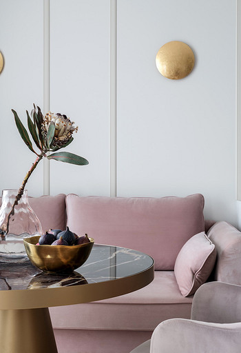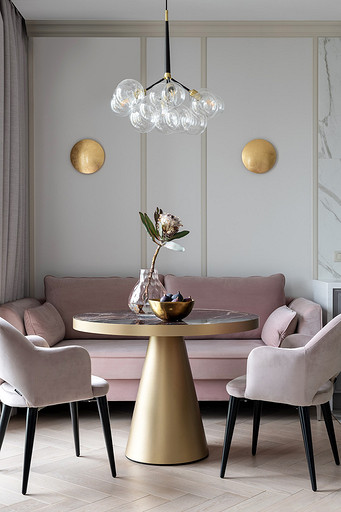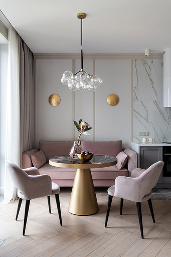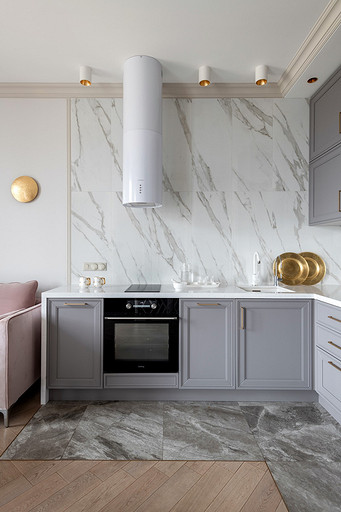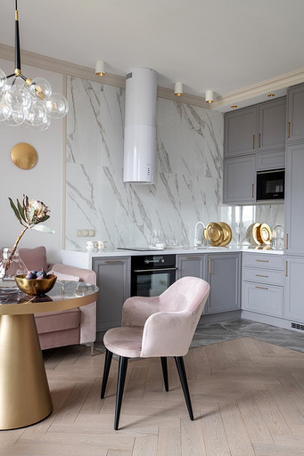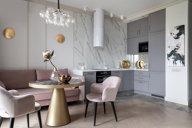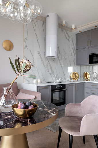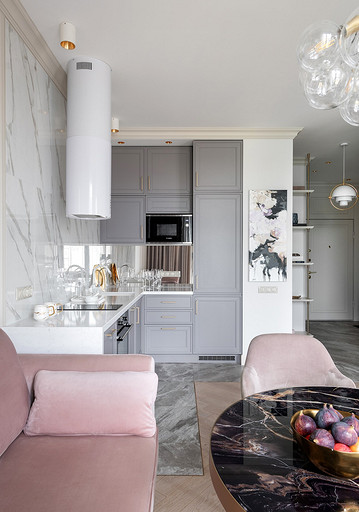 - Мебель: кухонный гарнитур «Атласлюкс», столешница Сaesarstone, диван Dreamma, стол Koza Home