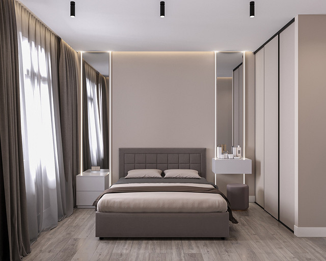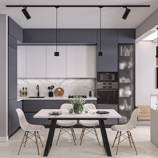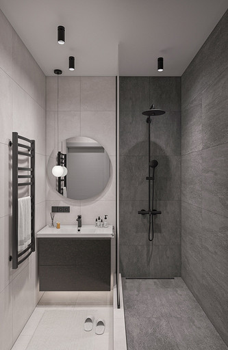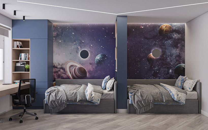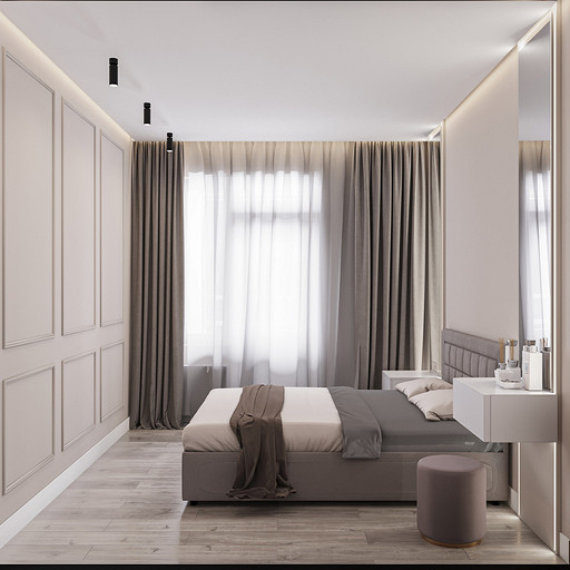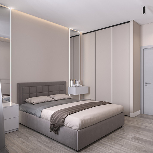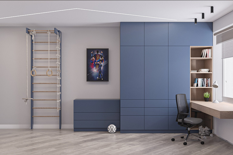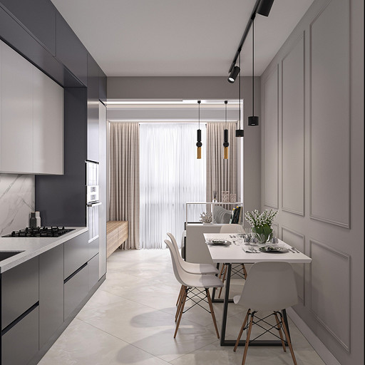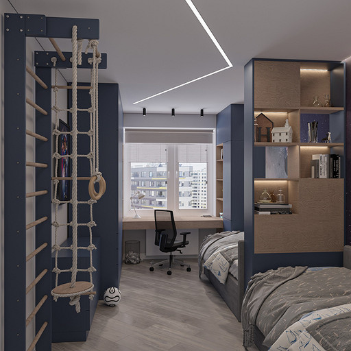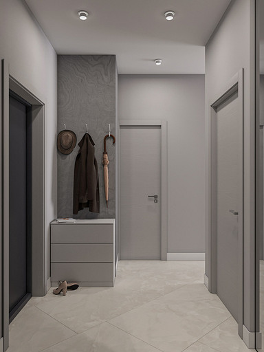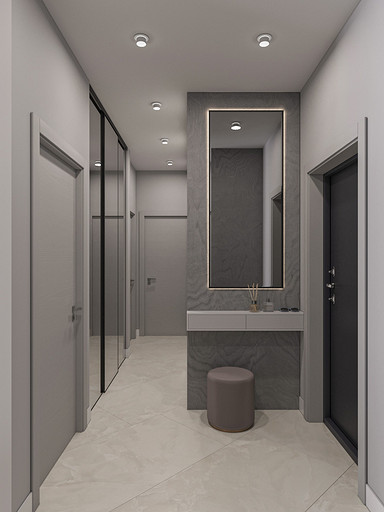 Проект выполнен в сентябре 2022 года для семьи, в которой подрастает будущее российского футбола — двое мальчишек 6 и 7 лет, которые очень много занимаются и мало времени проводят дома. Хозяйка пространства любит порядок, минимализм и лаконичность форм, а хозяин профессионально занимается отделкой и знает все особенности ремонта. Большая, дружная и современная семья, а места на 50 квадратных метрах не так много. Главной задачей проекта было организовать как можно больше мест хранения, сдержанно и лаконично оформить пространство в современном стиле, разместить два отдельных спальных места и рабочее место в детской комнате, выделить гостиную зону, в которой вся семья могла бы собираться вместе. Что сделали? Не обошлось без существенной перепланировки, но разместили всё, что нужно для комфортной жизни. Оформили пространство в нейтральной цветовой гамме. Монохромная палитра в коридоре напоминает нам о небе в городе, где будет реализовываться проект — Санкт-Петербург, плавно проникает в кухню и останавливается перед гостиной, где становится теплее за счет теплоты портьер и мебельного гарнитура под дерево.