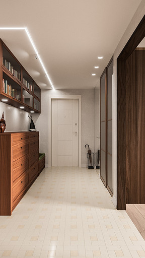 Всегда приятно, заходя в квартиру, ощущать себя комфортно — этому способствует просторное помещение. В нашем случае, мне удалось визуально расширить пространство благодаря зеркалу, светлой глянцевой напольной мозаикой и уместной подсветкой