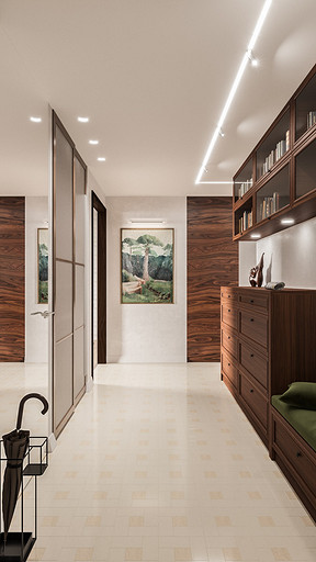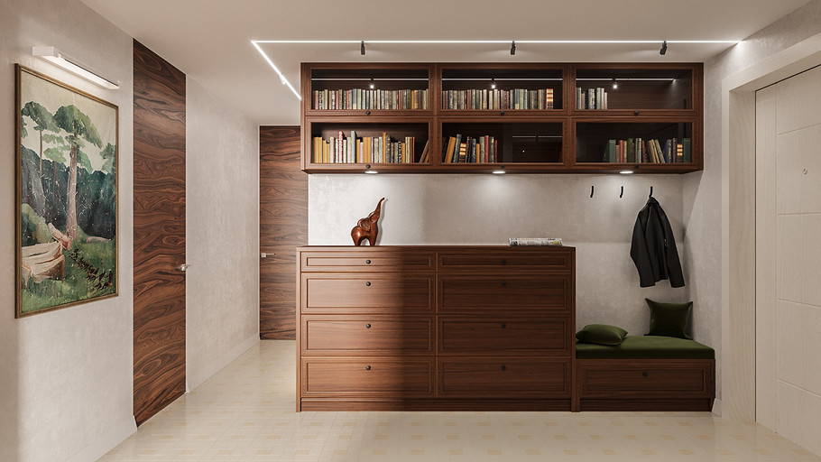 У хозяина этой квартиры есть большая домашняя библиотека, и почти в каждой комнате мы предусмотрели место для хранения книг. В прихожей мы оформили шкаф в ретро-стиле со стеклянными дверцами, открывающимися наверх