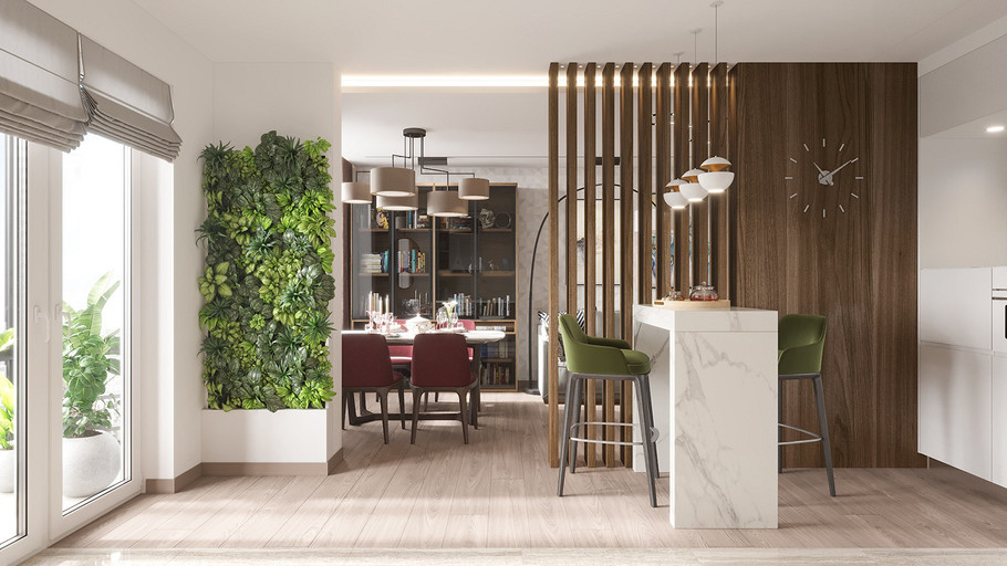 Оттенки свежей зелени, в сочетании с белым фоном и текстурой деревянного шпона, создают бодрящую палитру, позитивно отражающуюся на восприятие интерьера в целом