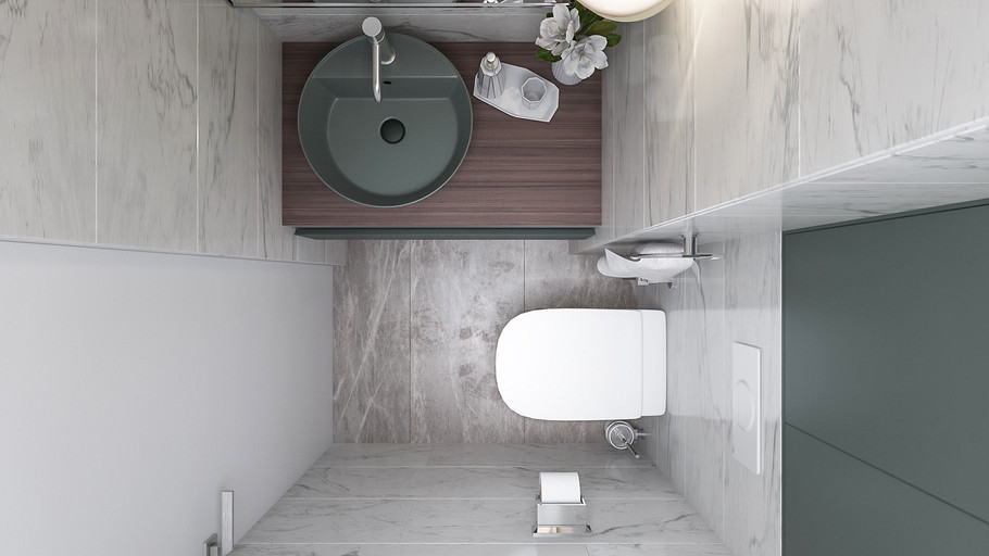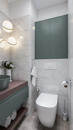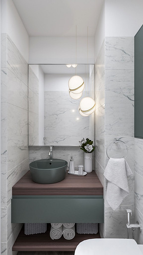 Этому очень небольшому пространству, придают уют два подвесных шара с теплым свечением. Гармоничное сочетание отделок: белый керамогранит, оливковый цвет и деревянная столешница