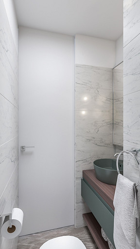 Эта дверь, скрытого монтажа, имеет две различные отделки: со стороны санузла — это безупречно гладкая поверхность, а со стороны прихожей — это зеркало от пола до потолка, которое создает прекрасное преломление пространства