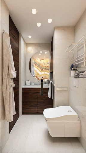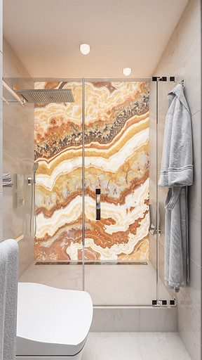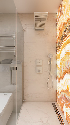 В душевой кабине нам удалось воплотить роскошный прием подсветки камня — оникса. Который мы расположили во всю стену душевой кабины. Энергетика солнечного камня заряжает и бодрит в утренние часы пробуждения