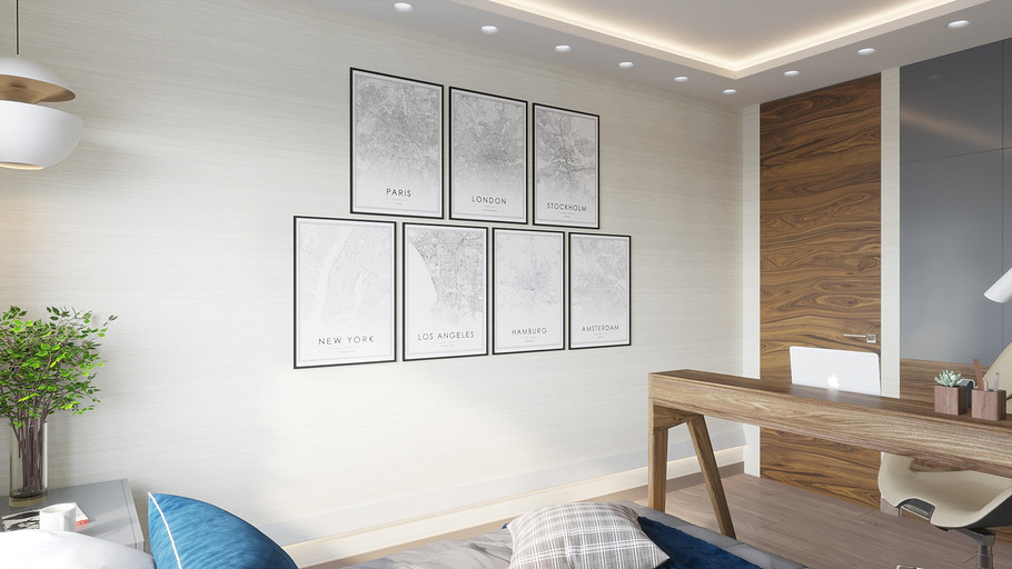 Черно-белые постеры, с изображением карт различных городов, дополнили свободную стену. Хозяину приятно глядя на них ностальгировать о прошлом