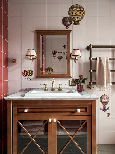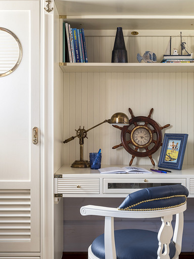 В интерьере использована мебель с элементами в виде иллюминаторов и своеобразной фурнитурой, светильники так же поддерживают тему помещения и даже сундук с сокровищами тоже имеется, а цветовая гамма просто и не могла быть иной.