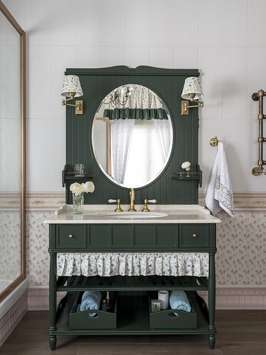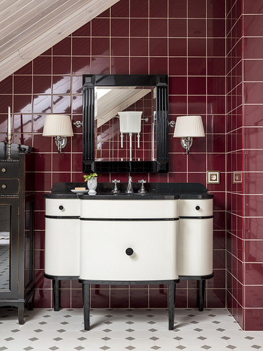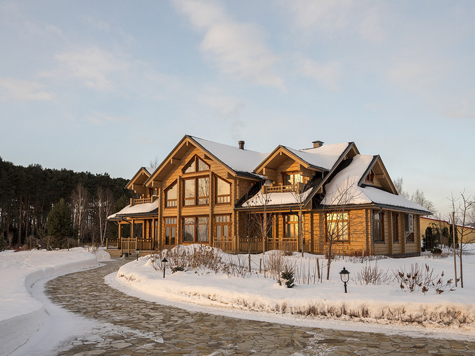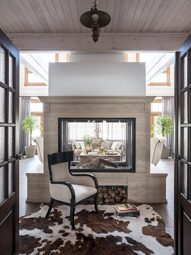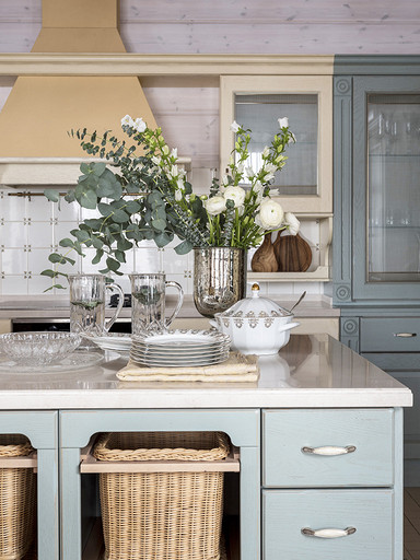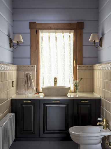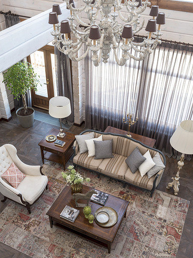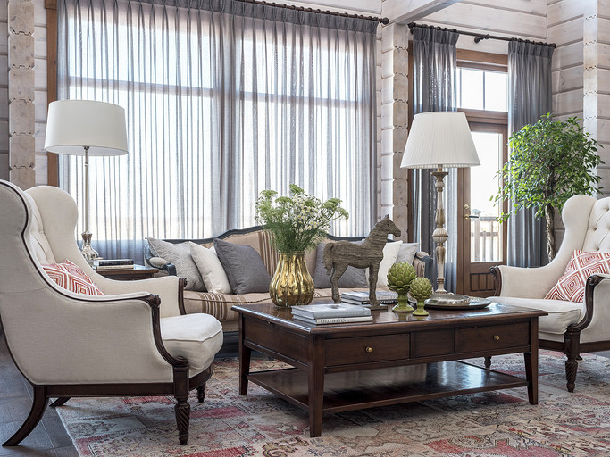 Загородный дом из бруса планировался как место отдыха для большой семьи. Пара хоть и молодая, но дом хотели видеть в классическом стиле, это обуславливалось тем, что расположен он в самой глубинке, в настоящем посёлке. В гостиной конечно главное место занимает камин, а он у нас особенный. Каминная топка, просто, огромная, облицована мраморным порталом и это не то чтобы центр гостиной, а как мне кажется, что это центр дома. В данном случае кухня и столовая являются одной зоной. Сам кухонный гарнитур уходит в кантри, что подчёркивают корзины в острове и мойка выполненная из искусственного камня. В доме несколько спален и каждая интересна по своему