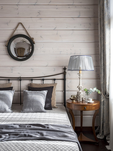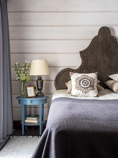 - В хозяйской спальне цветовая гамма сдержана, а акцент сделан на необычном изголовье с клёпанными элементами, что даёт нам понятие о стилистике помещения, а соломка настольных ламп ещё раз напоминает нам, что это загородный дом, что тут природа. Завязывает композицию достаточно смелый орнамент на декоративных подушках.