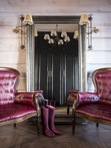 - И ещё одна гостевая спальня решена в классическом ключе, по цвету также очень сдержанна. Здесь идёт некое сопоставление брутальности и изящности: достаточно массивный шкаф и кожаный сундук прекрасно подружились с утончёнными резными настольными лампами и кованным изголовьем кровати. И даже по цвету абажуры настольных ламп, кажутся нам ещё более воздушными при соотношении с достаточно мужским оттенком серого в покрывале.