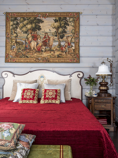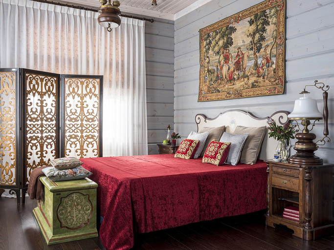 - В одной из гостевых, как я ранее писала, мы постарались нарочито сделать богатое убранство, тут и расписная мебель, гобелены и очень необычная резная ширма. В этой спальне каждый предмет интересен, и оригинален по-своему)))