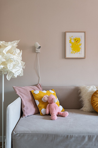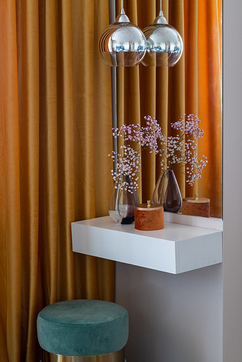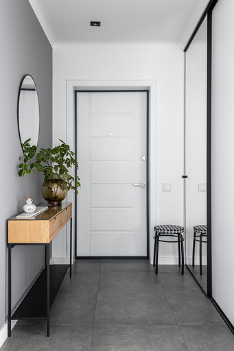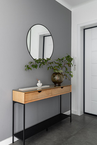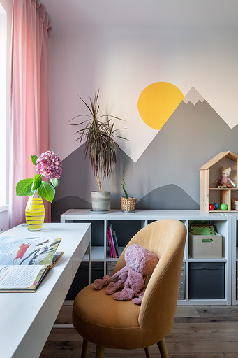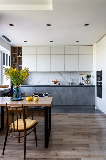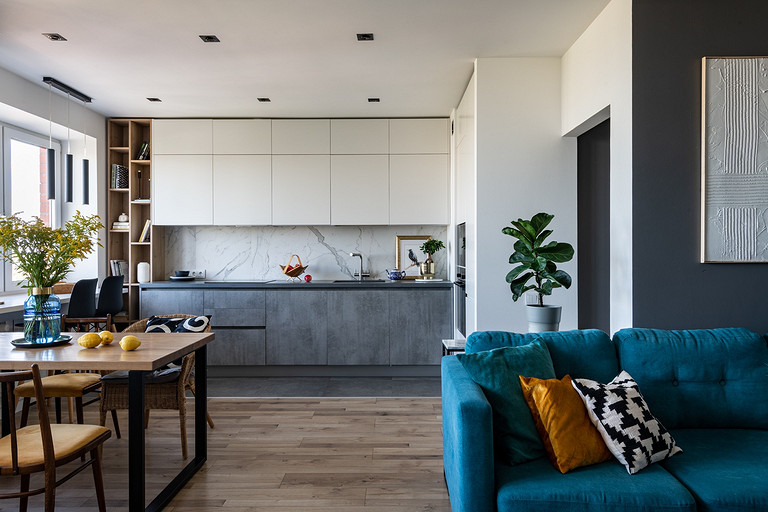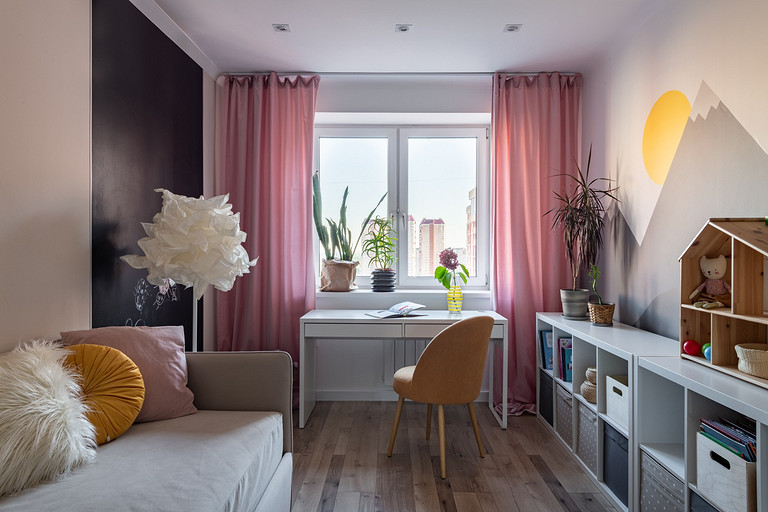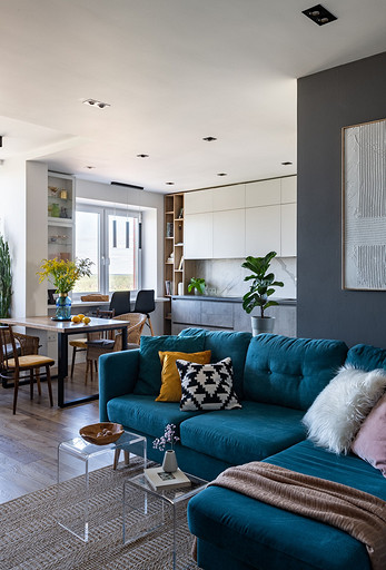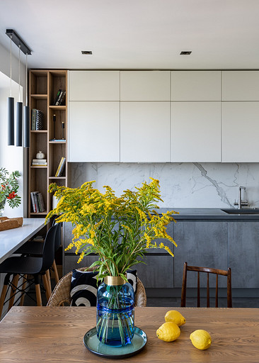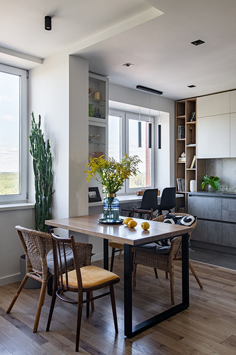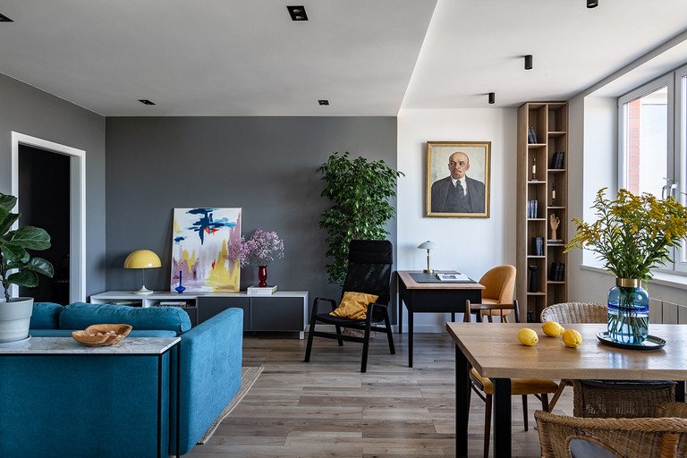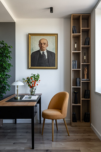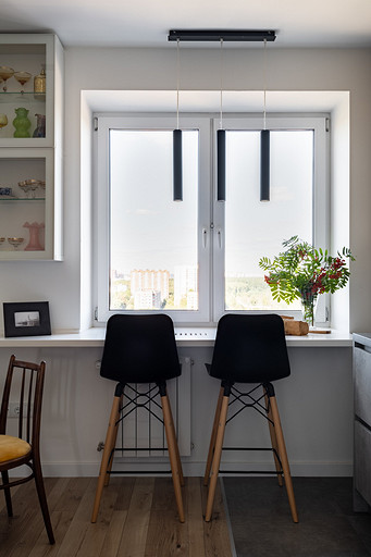 - Мебель: divan.ru, ТВ-тумба, кресло, письменный стол, обеденные кресла и подвесные витрины ИКЕА, консоль и рабочий стул La Redoute, стеллажи и обеденный стол сделаны на заказ, винтажные стулья «Лигна», кухня «Кухонный двор»