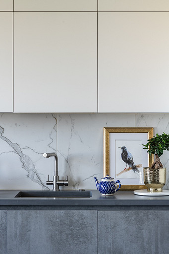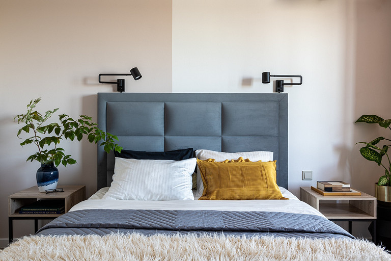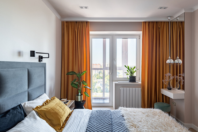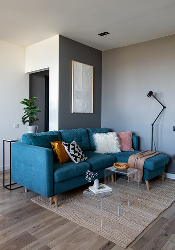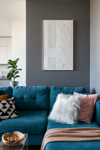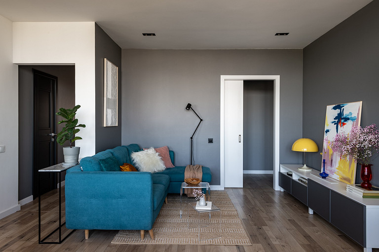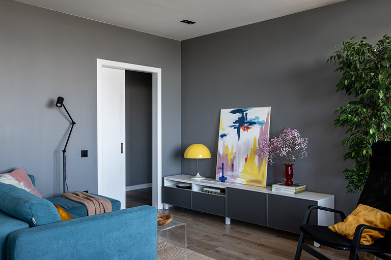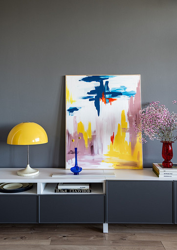- Декор: картина в ТВ-зоне и гипсовое панно за диваном — Алена Матисова, картина на столешнице — Ирина Королева