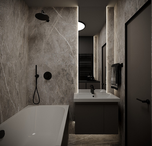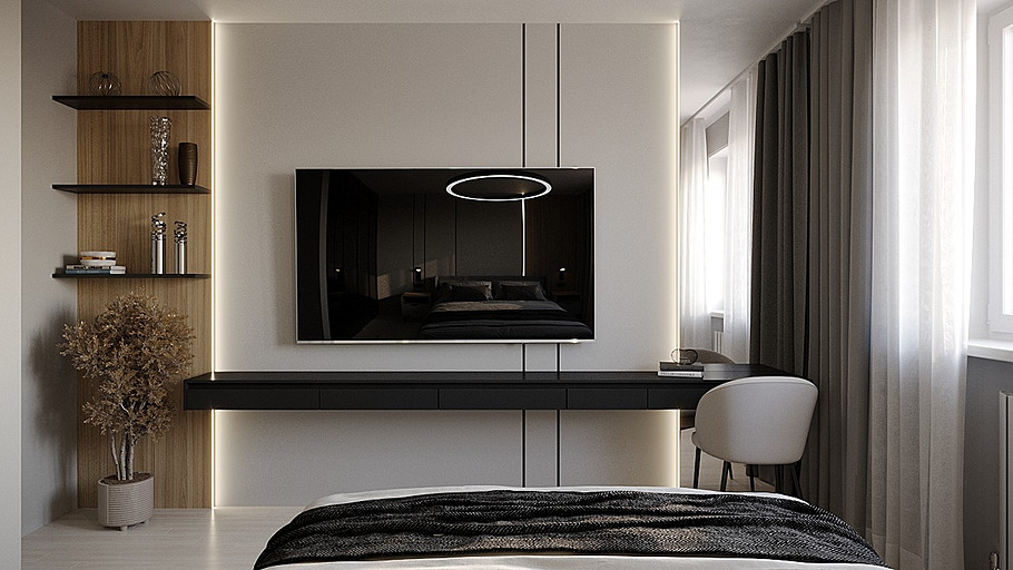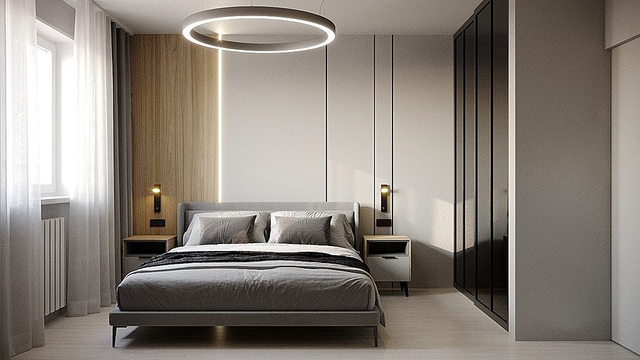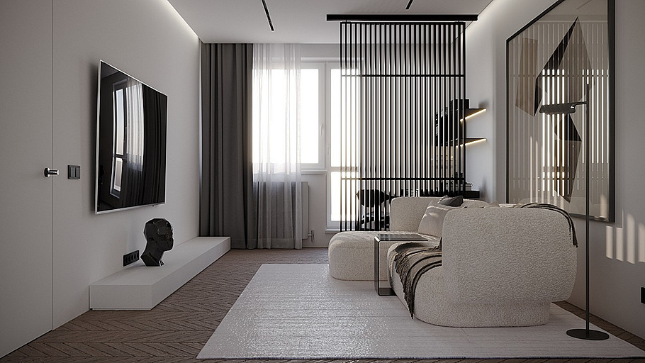 Проект выполнен в стиле скандинавский минимализм. Так, пространство каждой комнаты визуально не перегружено, в квартире достаточно “воздуха”, а сам интерьер выглядит современно и утонченно. Стиль скандинавский минимализм отлично подходит для квартир в шумном городе, так как позволяет в свободном от лишних деталей пространстве хорошенько отдохнуть или продуктивно поработать. Каждая из комнат имеет достаточное для комфортного проживания количество естественного освещения. Более того, комнаты кажутся более светлыми благодаря цветовой гамме, состоящей из оттенков молочного, серого цветов и акцентов темного коричневого цвета.