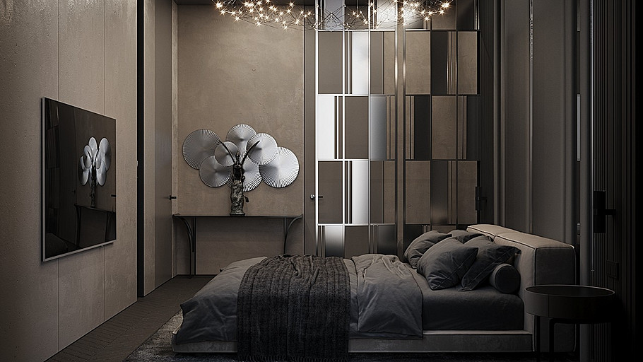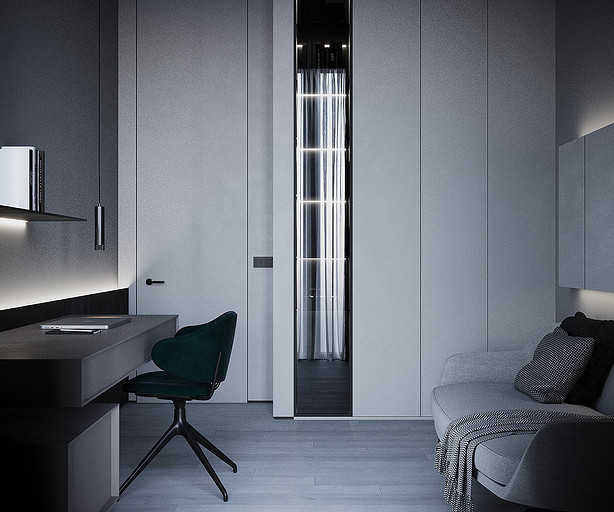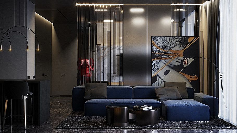 Апартаменты в Москва-Сити — это смелый, современный дизайн и сочетание ярких форм с классическими, сдержанными мотивами в отделке. По отдельности мебель и материалы кажутся совсем разными, но их сочетание вносит в интерьер динамику и жизнь. Дизайн апартаментов не обошелся без акцентов: цветовых — ярко-синий диван, фактурных — керамогранитная плита и световых — потолочная подсветка.