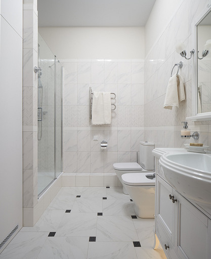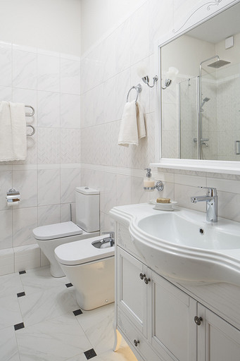 - Сантехника: унитаз и биде Roca, душевой поддон RGW, душевое ограждение Radaway, смесители Grohe, Teka