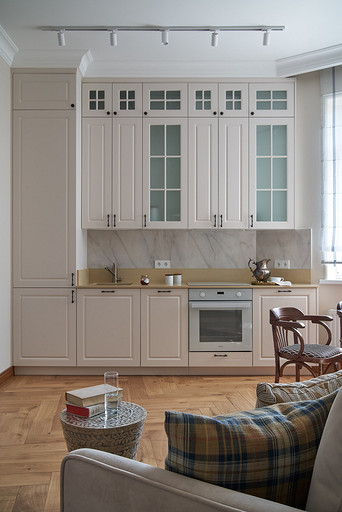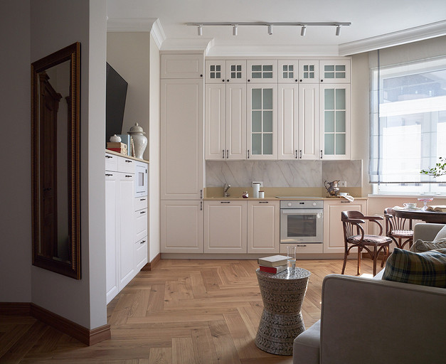 - Мебель: обеденный стол и стулья — группа компаний «Пирамида», диван Siesta Gallery, кофейный столик Dantone Home, кухонный гарнитур Bellissimo, фурнитура Blum, столешница — кварцевый агломерат «Авант»