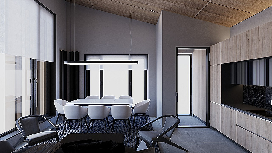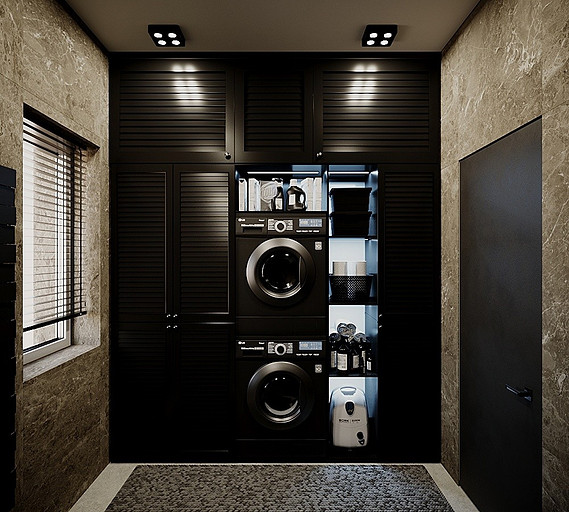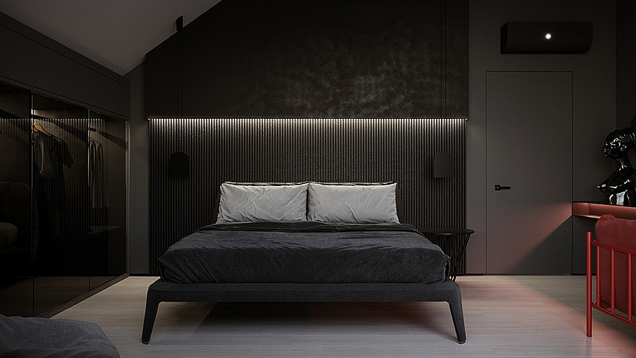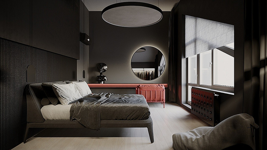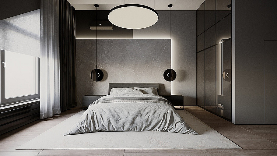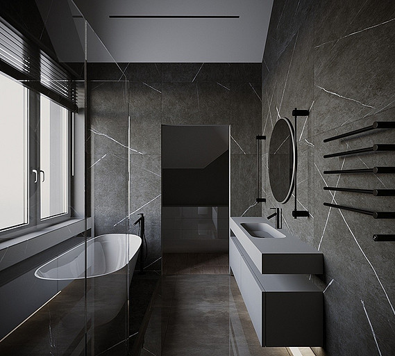 Проект выполнен в современном минимализме преимущественно в теплых серых и черно-белых тонах.