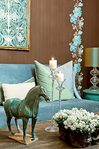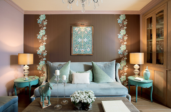 по обе стороны дивана расположили столики Van Roon с резьбой, а на них- стеклянные лампы с абажурами из тафты