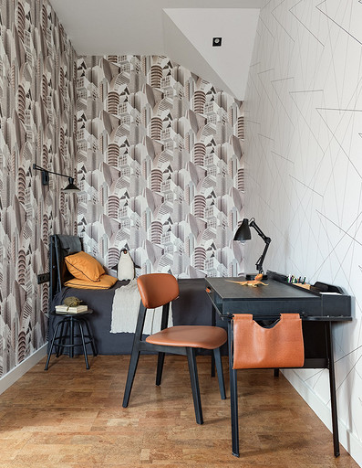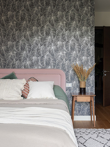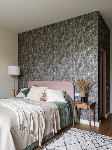 - Стены: обои под покраску AS Creaton, краска Mons, акцентные обои за кроватью Rasch