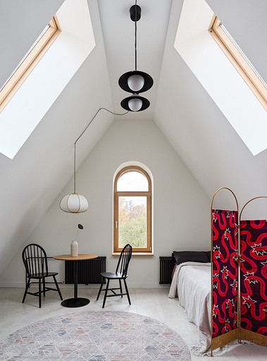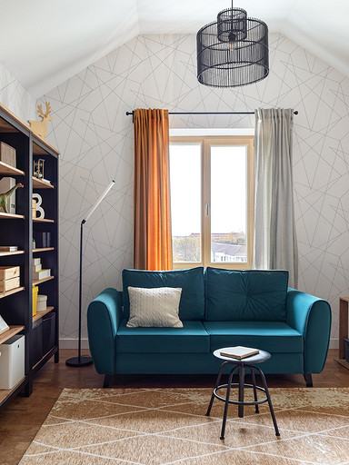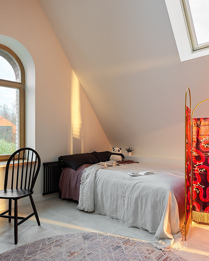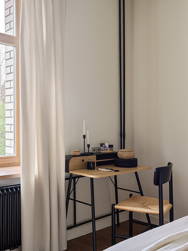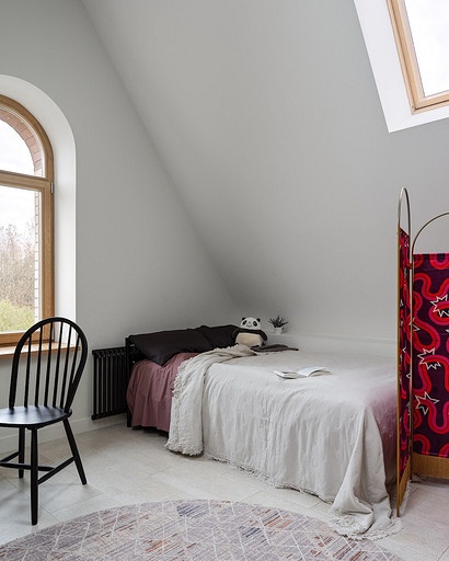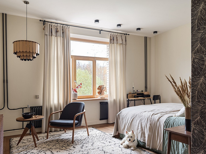 - Текстиль: ковер и большое покрывало La Redoute, маленькое покрывало на кровати, плед на стеллаже-лестнице и декоративные наволочки H&M Home, шторы — на заказ, Анна Карпенко, декор на шторах — Ольга Халезова