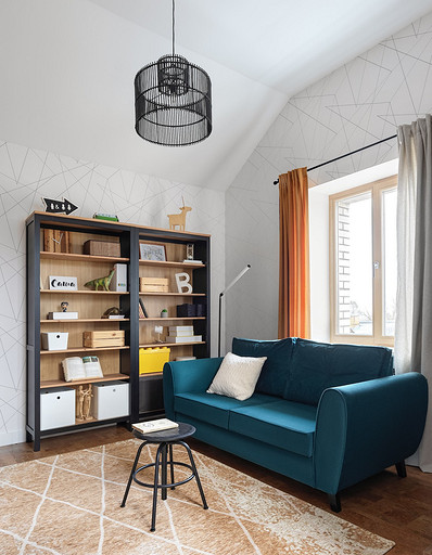 - Мебель: кровать и письменный стол Cilek, рабочий стул Artfabric, табурет и стеллажи ИКЕА, диван divan.ru