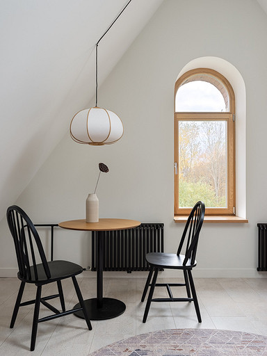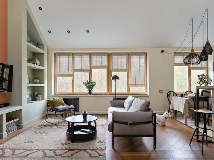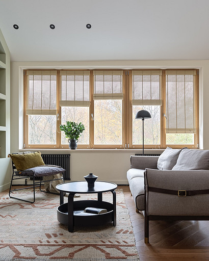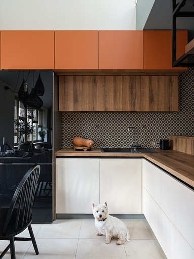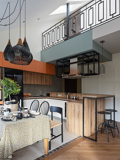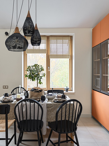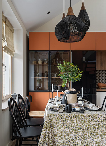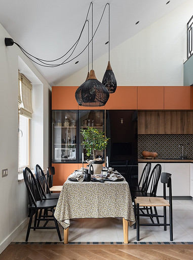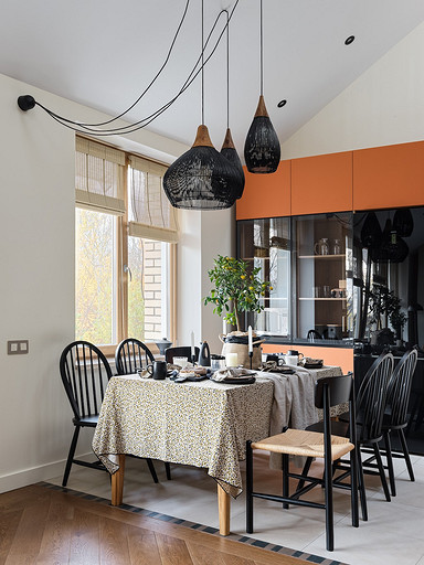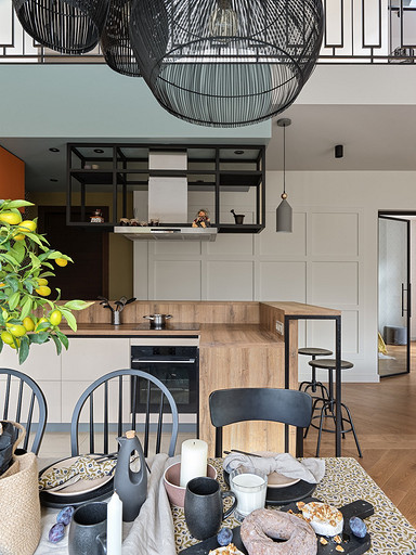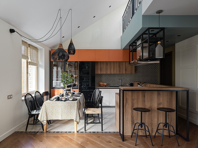 - Мебель: кухня сделана на заказ в Golland Pro, обеденный стол — собственность хозяев, стулья La Redoute, табуретки у барной стойки и журнальный столик ИКЕА, диван Commune, кресло H&M Home