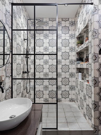- Стены: плитка Kerama Marazzi, стена за ванной из керамогранита Dual Gres