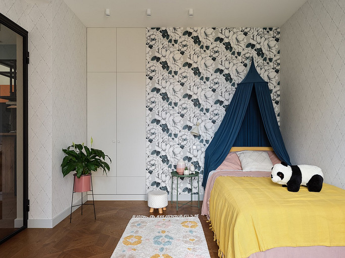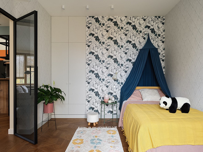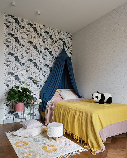 - Стены: обои в цветок Vallila, фоновые обои Eco Wallpaper