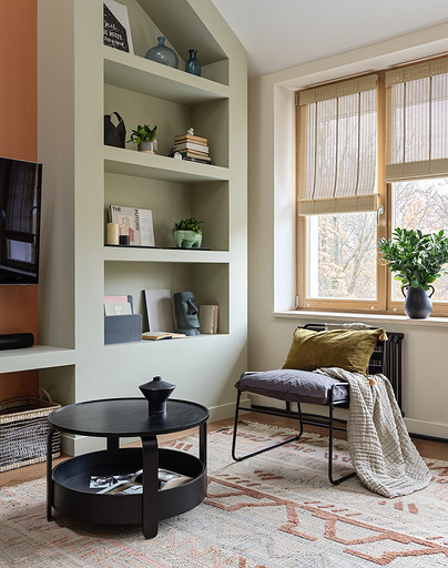 - Мебель: кровать — собственность хозяев, прикроватный столик, журнальный столик и стеллаж-лестница Teak House, туалетный столик, комод и стул La Redoute, кресло Artfabric