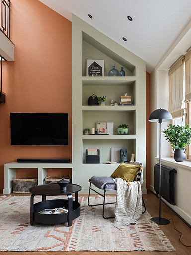 - Декор: наполнение стеллажа ИКЕА, деревянные часы в стеллаже Teak House