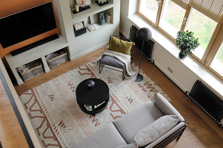 - Освещение: накладные светильники Maytoni, торшер ИКЕА, подвес над журнальным столиком Roomton