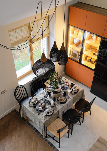 - Освещение: подвесы над столом Teak House, подвес над барной стойкой Sturm, встроенные и накладные светильники Maytoni, торшер La Redoute