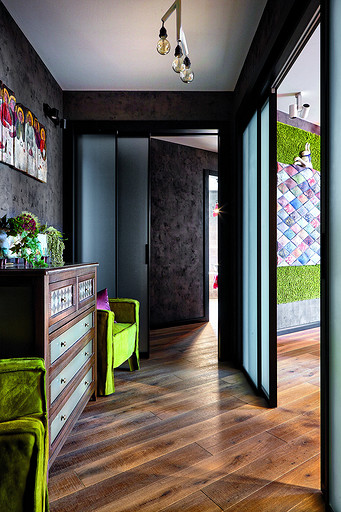 Супруги мечтали, чтобы в новой квартире был создан целый мир для большого семейства, органичный их мировосприятию, наполненный яркими красками, пробуждающий у детей фантазию и интерес к творчеству. Отправной точкой в оформлении интерьера для дизайнера стала сказка «Алиса в Стране чудес».