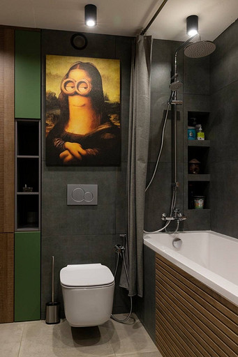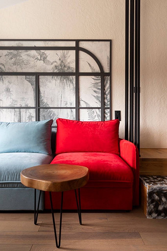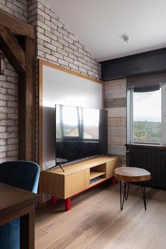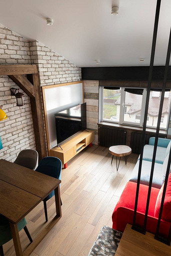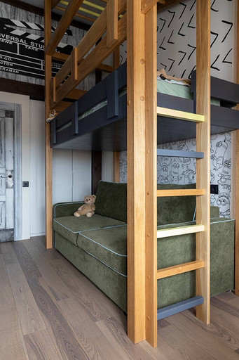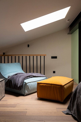 Проект реализован в стиле лофт, это мансардный этаж с высокими потолками, благодаря чему нам удалось организовать второй этаж под спальную комнату.