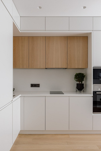 - Бытовая техника: индукционная варочная панель, духовой шкаф, СВЧ, холодильник и посудомоечная машина Bosch, вытяжка Krona