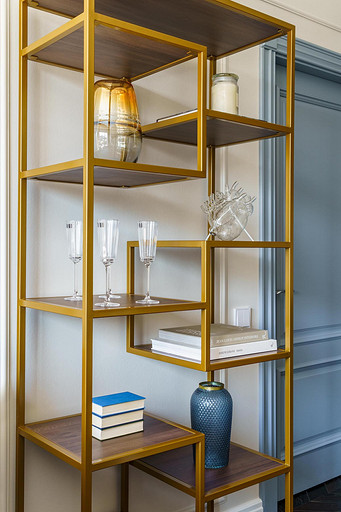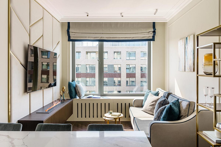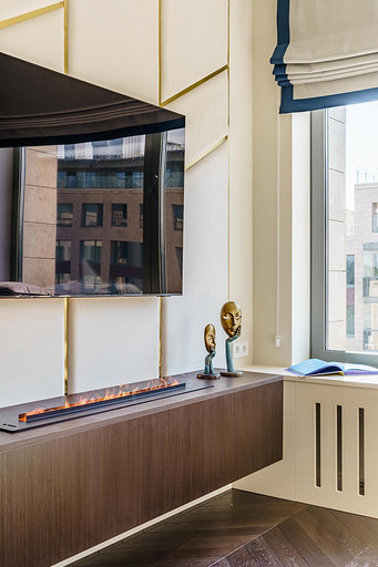 - Мебель: раскладной диван Fluffy & Puffy, полубарные стулья Garda Decor, журнальные столики Dantone Home, стеллаж, мягкие панели c латунными вставками, тумба под паровой камин и кухонная мебель Mebelit