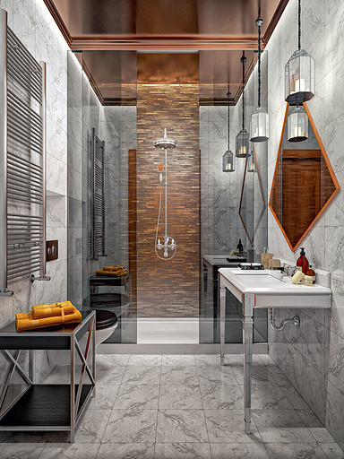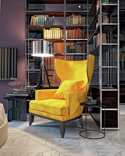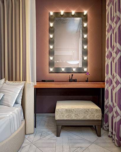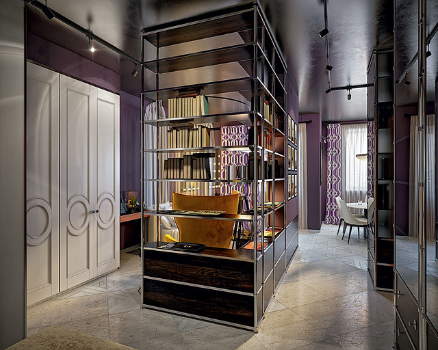 Особенность проекта: после демонтажа ненесущих перегородок и реализации оригинальных приёмов зонирования небольшая по площади типовая однокомнатная квартира преобразуется в богемную студию эпохи джаза, оформленную в стиле ар деко.