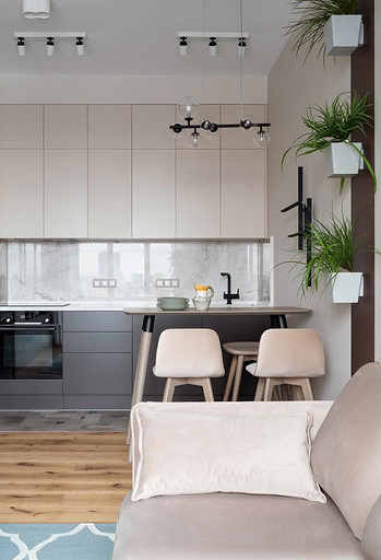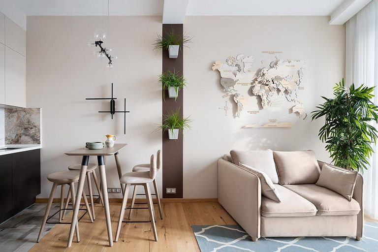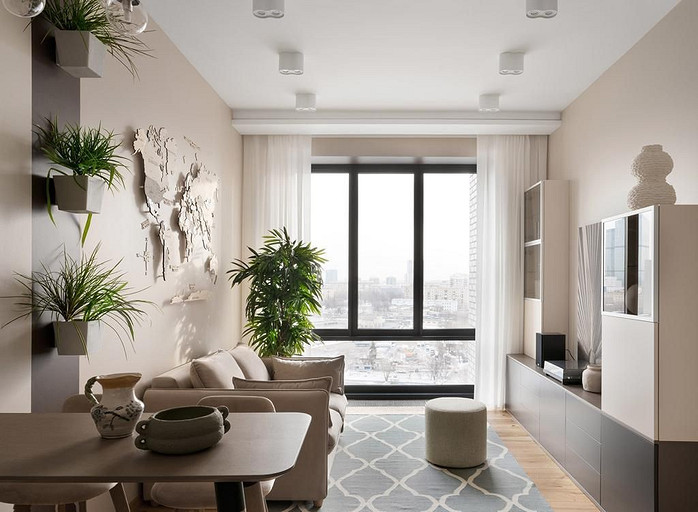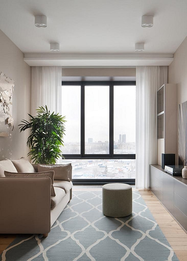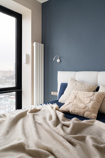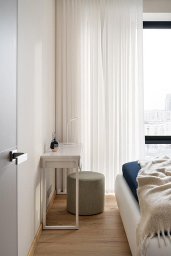 В квартире 45м со свободной планировкой молодая хозяйка хотела создать свой первый дом, со спальней, гардеробной и гостиной. Квартира сдавалась без перегородок, свободной планировки. 2 окна в пол, высокий этаж, вид на Москва-Сити. Необходимо было предусмотреть рабочие зоны для работы двух человек, изолированные друг от друга.