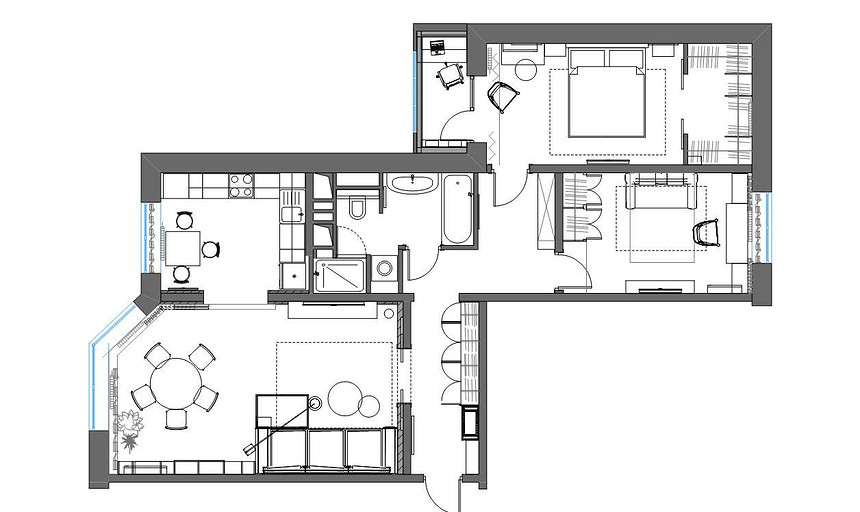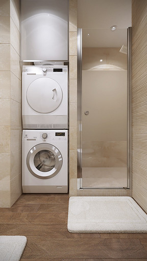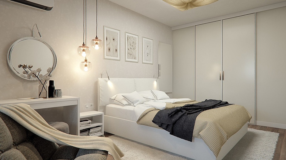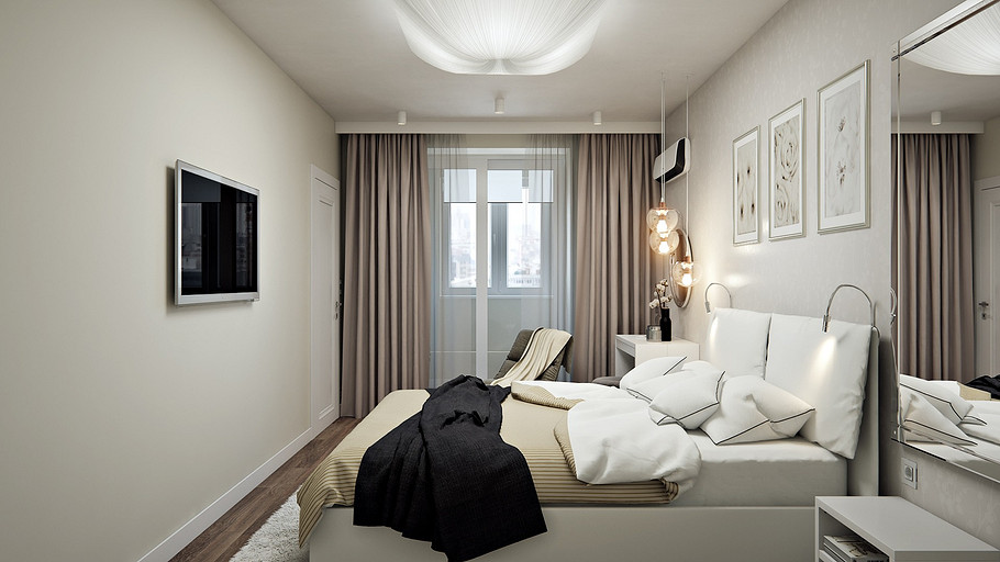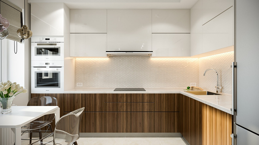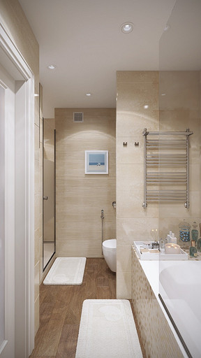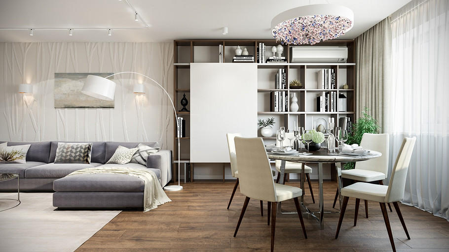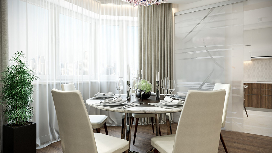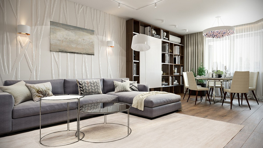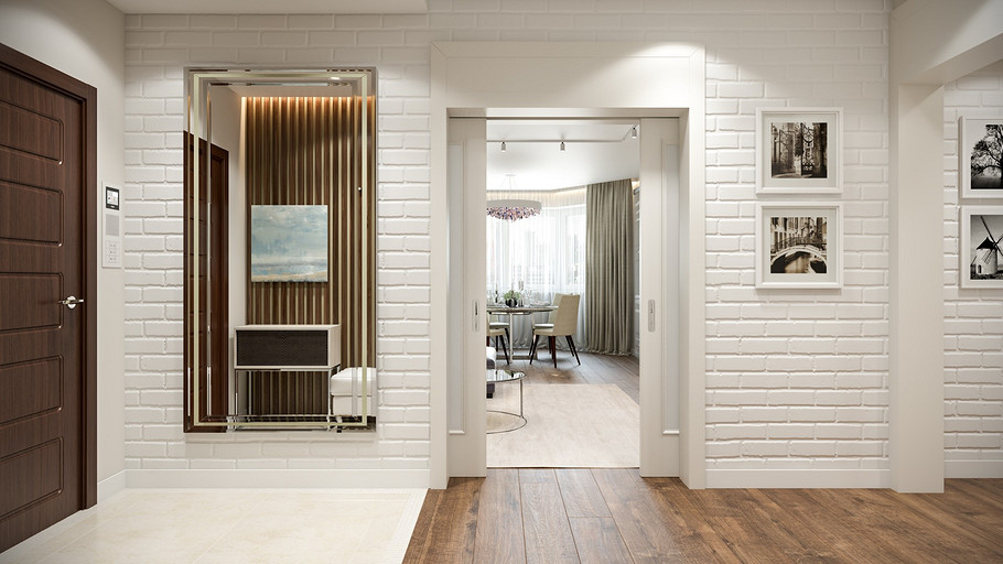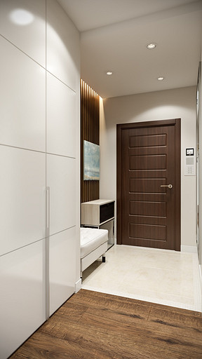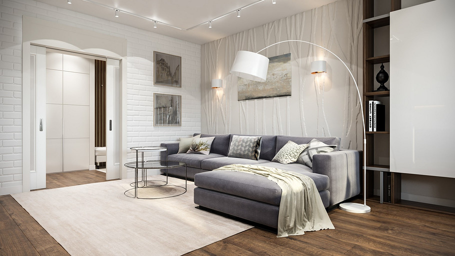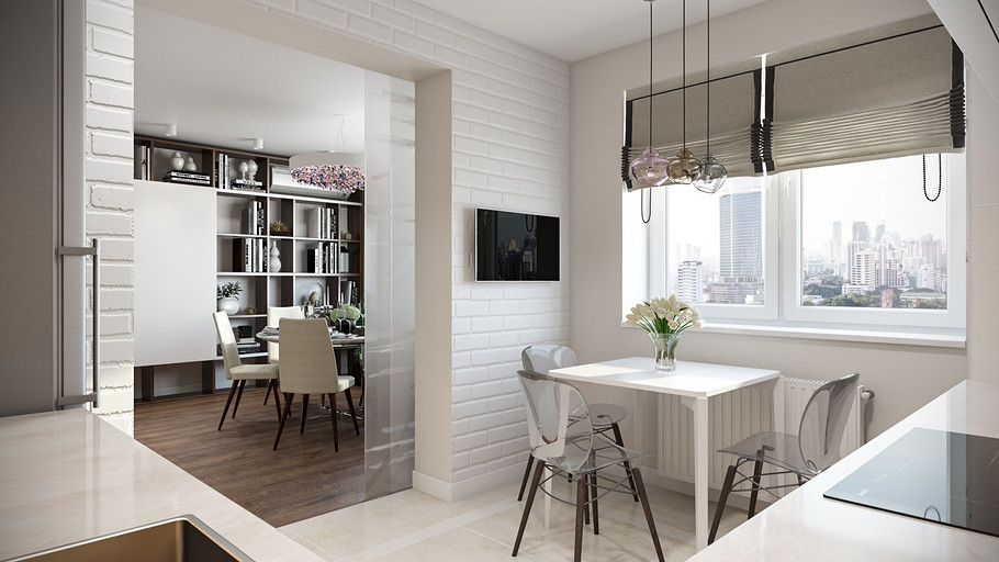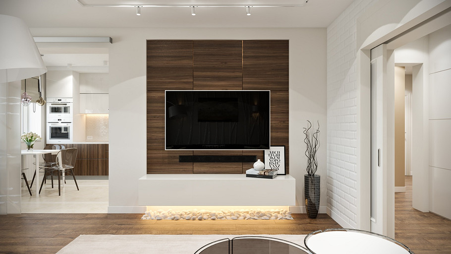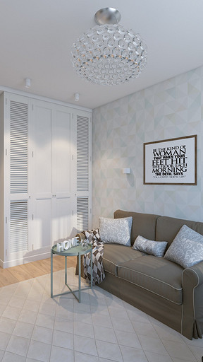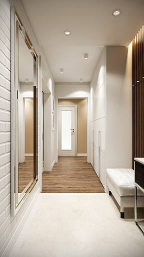 Заказчик поставил задачу при проектировании интерьера визуально поднять невысокие потолки, создать открытое светлое пространство, актуальное на долгие годы, без авангардных излишеств. Квартира находится в новостройке, в центре мегаполиса, поэтому экотема, тема природы в интерьере звучит особенно актуально. В гостиной на стене за диваном создан графичный рельеф, изображающий деревья без листвы. В отделке использованы природные материалы: галька, стекло, дерево. Фотоизображение европейской улочки на стене в коридоре напоминает о беззаботном отпуске. Всё призвано создавать атмосферу комфорта и отдыха от суеты большого города.