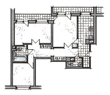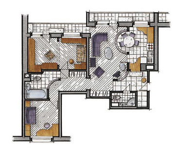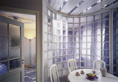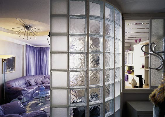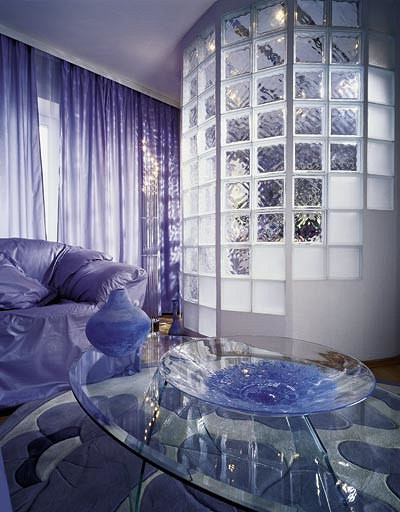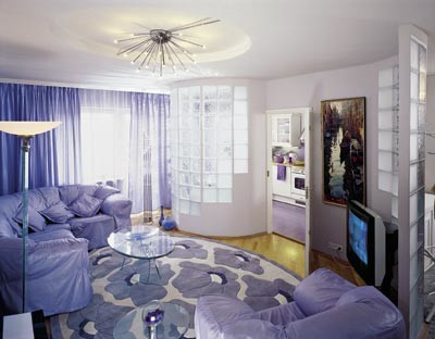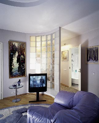 Трехкомнатная квартира общей площадью 85 м2: репрезентативная зона в сиреневых тонах, терракотовый кабинет и полукруглые перегородки из стеклоблоков. Читать далее...